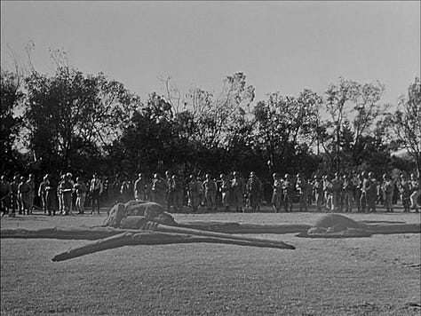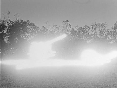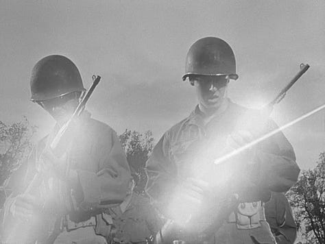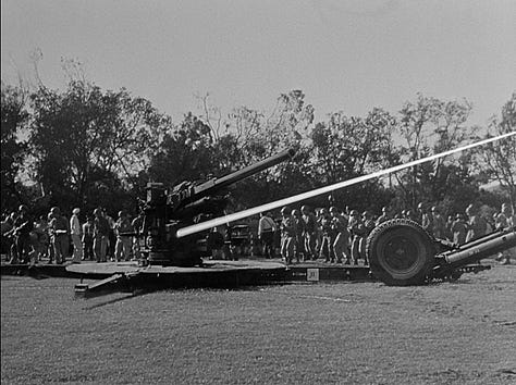 Gort’s beam weapon is especially well done. His visor rises, revealing a spooky, pulsating Cylon-like eye. The action of the beam itself is animated, reminding me of the weapons from Forbidden Planet (1956) which were rendered by Disney Studios in delicious color. Once again we see real thought being put into the effect, which proceed in stages. The light extends, fills the object to be disintegrated, and the object disappears. In the case of larger objects, like tanks, we beam retreats to reveal some kind of slag left behind on the ground.