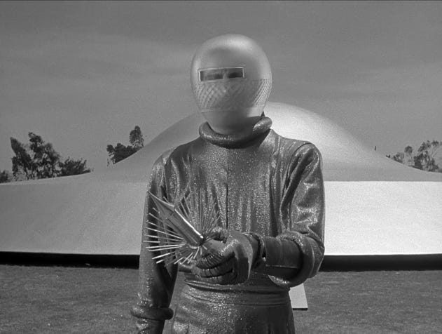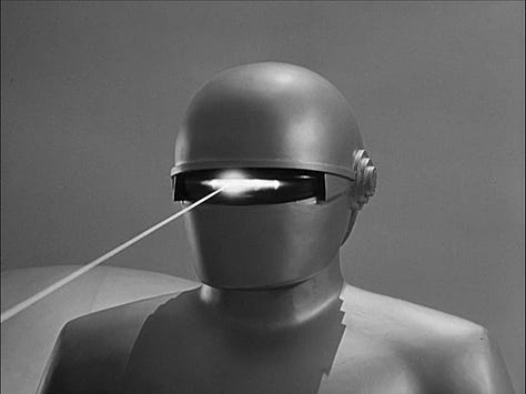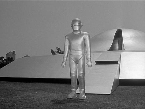 Okay, so Gort is great/not-great - but because this is 1951, he’s utterly great. The costume designer had a huge conundrum, wanting to replicate in the towering robot the silent, unutterably smooth and seamless mechanisms of the ship itself. But, elbows and knees, right? It wouldn’t be until 40 years later in Terminator 2 that filmmakers would use digital technology to produce the appearance of liquid metal, so something like spray-painted neoprene was the closest they could get. And yes, the foam rubber tubes on Gort’s arms and legs have an unavoidable and awkward buckle. Yet, they did what they could, even going to the lengths of producing two suits so they could make it look like the suit has no seams. A fiberglass version was also made for close-up shots of the visor.