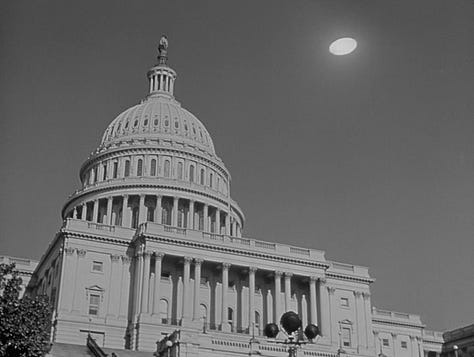 As compelling as Edmund North’s dialogue and characterizations are, regarding Klaatu’s mission there is one gaping crack in the plot. We learn that Klaatu is a representative of an interstellar union of alien races that have come to a unique collective security agreement. They seem organized enough to have a very specific protocol, reminiscent of Star Trek’s Prime Directive, as to how and when to approach non-members. Before first contact with Earth, for example, they spend years monitoring radio broadcasts to learn the language and, one assumes, all manner of information about the planet and its people. Klaatu’s mission is to deliver a message to representatives from all the nations of the Earth, and that his message “concerns the existence of every last creature on Earth.” Klaatu suggests a meeting with the United Nations or chiefs of state, but all his efforts working through official channels are rebuffed.